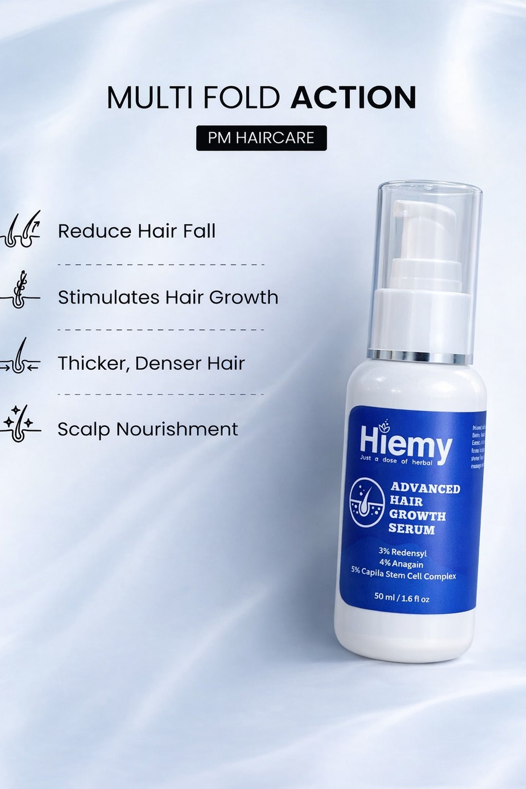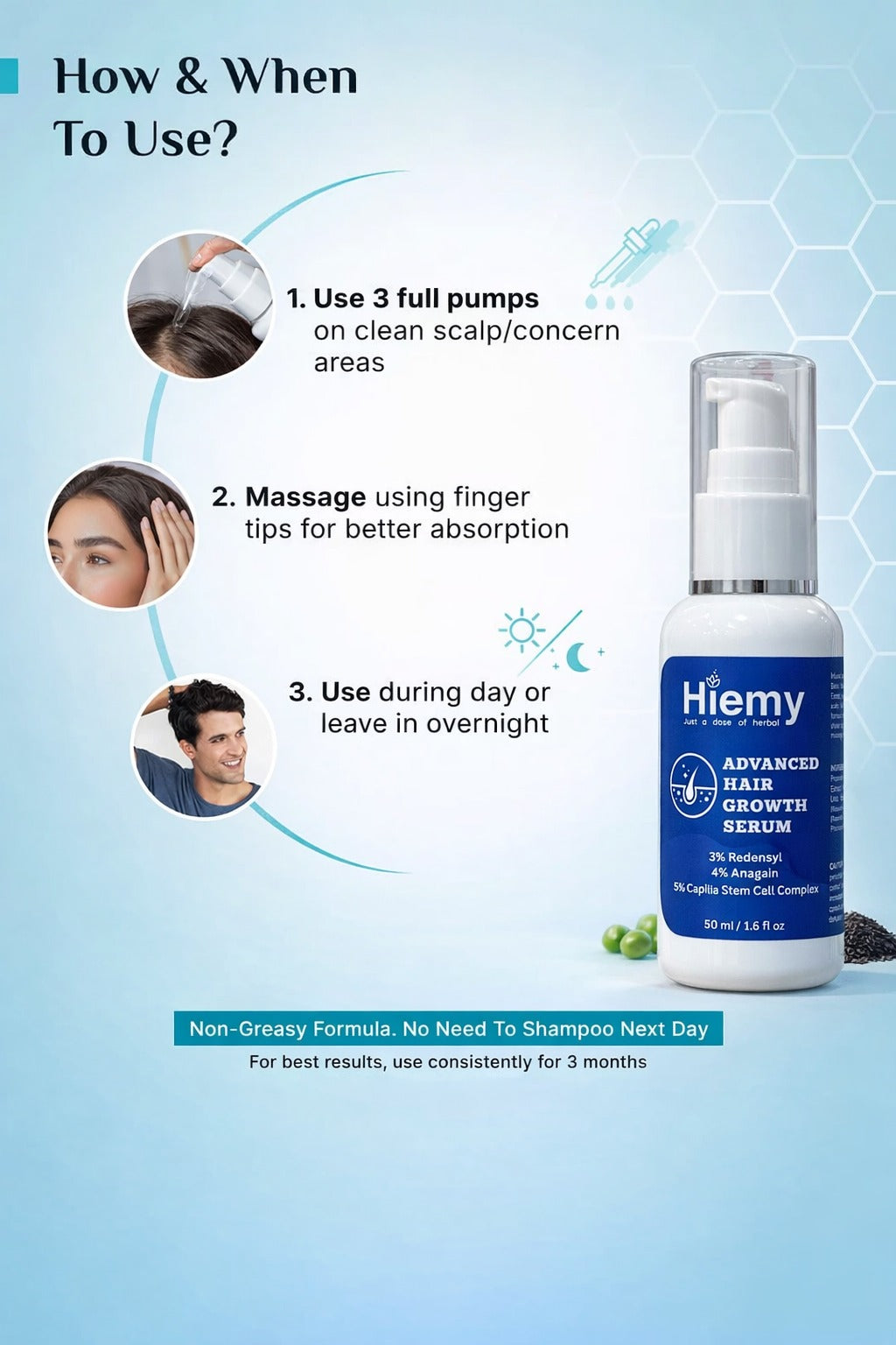 Hiemy Advanced Hair Growth Serum is powered by a scientifically developed blend of Redensyl, Anagain, and Capilia Stem Cell Complex that helps stimulate hair follicles, reduce hair fall, and promote stronger, thicker-looking hair.